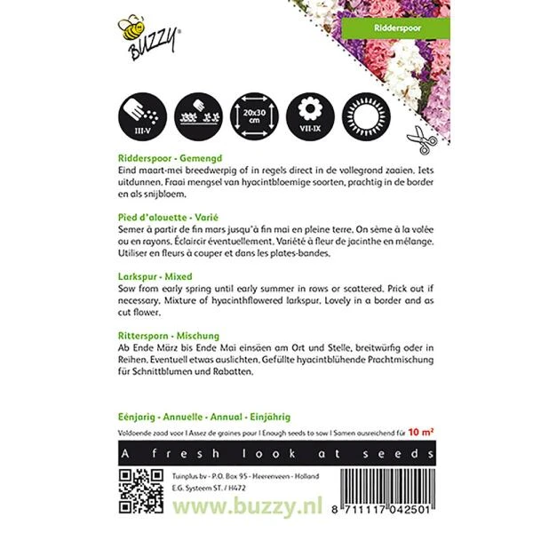Deze verpakking bevat een zaadmengsel waaruit blauwe, lila roze en witbloeiende planten groeien. De gevulde bloemtrossen doen aan enorme hyacinten denken.